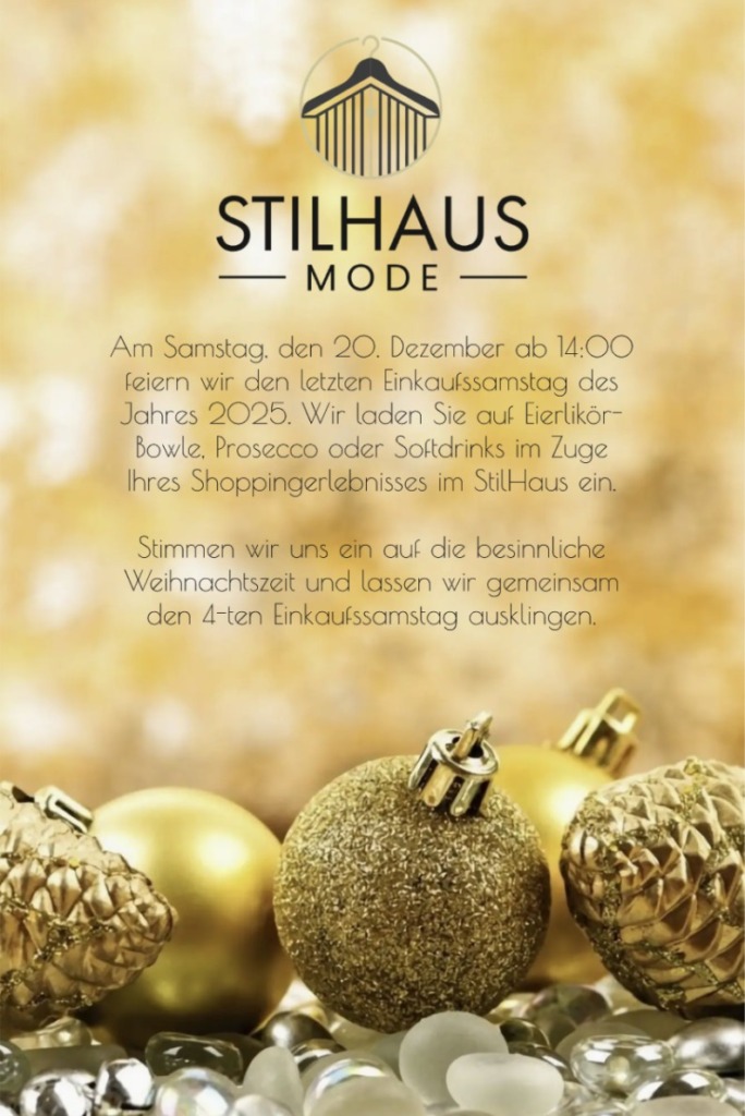 Bei Eierlikör-Bowle, Prosecco, Fingerfood etc. laden wir euch ein, euren Shoppingtag im StilHaus zu beenden und mit uns gemeinsam in die besinnliche Weihnachtszeit zu starten.